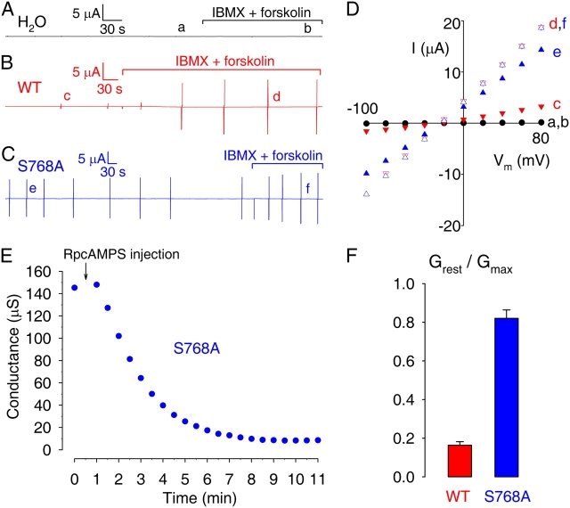 Figure 3. . Membrane conductance of resting and activated oocytes expressing WT or mutant S768A CFTR. Current time courses, recorded under two-microelectrode voltage clamp, of oocytes injected with water (A), or with cRNA encoding (B) WT or (C) S768A CFTR. Membrane potential was held near the resting potential (between −40 and −20 mV). Membrane conductance was monitored at regular intervals using brief voltage steps (vertical lines); complete current/voltage (I/V) relationships were determined under resting conditions (time points a, c, e), and after activation of cellular PKA with 50 μM forskolin + 1 mM IBMX (time points b, d, f). (D) Representative I/V plots under conditions as indicated in A–C, showing steady currents measured by averaging current samples toward the ends of 75-ms steps to voltages between −100 and +80 mV. (E) Rapid reduction of resting conductance (from 145 to 8 μS) upon injection of RpcAMPS into an oocyte expressing S768A CFTR. (F) Ratios, for WT- and S768A-expressing oocytes, of membrane conductances at rest (Grest), and after maximal activation of CFTR (Gmax); conductance values were similar for oocytes injected with 2.5 or 5 ng of each cRNA, so pooled results are shown. |