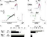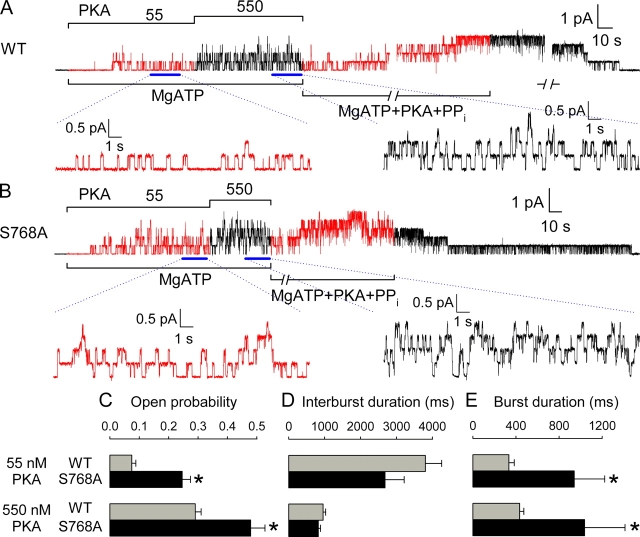 Figure 6. . Kinetic behavior of WT and S768A CFTR channels in excised patches exposed to low and high [PKA]. Representative baseline-subtracted current traces of (A) four WT and (B) five S768A channels, recorded from excised patches in the presence of 2 mM MgATP + 55 nM or 550 nM PKA; 20-s segments (indicated by bars) under each condition are shown with 10-fold expanded time scale, below. Channels were counted by locking them in the open-burst state with 0.1 mM MgATP + 2 mM pyrophosphate (PPi) + 300 nM PKA. (C–E) Open probabilities (C), mean interburst (D) and open burst (E) durations at 55 nM (top) or 550 nM PKA (bottom), for WT (gray bars) and S768A (black bars) CFTR channels; asterisks indicate significant differences between S768A and WT (0.001 < P < 0.06). |