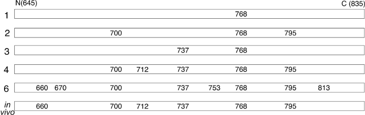 Figure 9. . Summary of R-domain serines found to be phosphorylated by mass spectrometric analysis of trypic digests of bands (1, 2, 3, 4, 6 as indicated) from SDS-PAGE gels after in vitro phosphorylation (data from Fig. 2) or of full-length WT CFTR isolated from resting oocytes (in vivo; data from Fig. 4). Ser 768 is the first site phosphorylated, and is found phosphorylated in oocytes at rest; the major mobility shift to band 3 is associated with phosphorylation of Ser 737. |