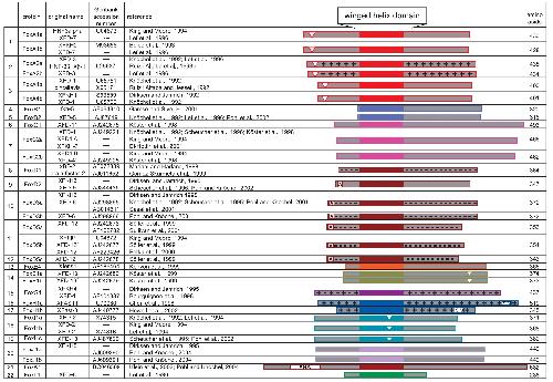 Transcription factors of the Fox (fork head box) family have been found in all metazoan organisms. They are characterised by an evolutionary conserved DNA-binding domain of winged helix structure. In the South African clawed frog, Xenopus laevis, more than 30 Fox genes have been found so far. This review summarises our present knowledge regarding the general structure and common features of the fork head box and will then characterise Fox genes that have been described in Xenopus. Special attention was paid to the temporal and spatial expression patterns during early embryonic development. For some of these genes, the molecular mechanisms leading to their regulation after the onset of zygotic transcription are known. We also report on functional aspects including target gene regulation, cell or tissue specification and interference with the cell cycle. Finally, Fox proteins serve as mediators of signalling pathways and they might function as checkpoint molecules for the cross-regulatory interactions of different intracellular signal transduction chains.