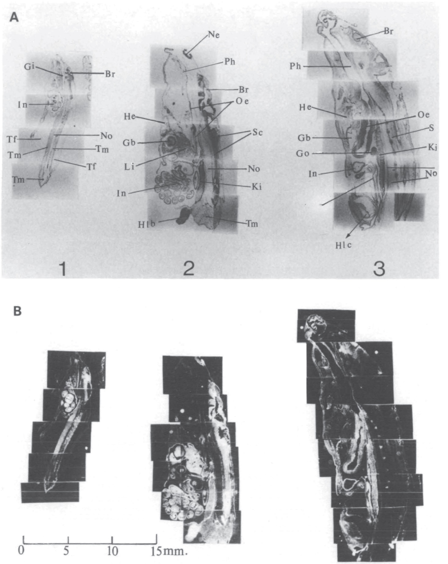 Fig. 4. Composite assembly of sagittal sections of (A) bright- and (B) dark-field imaging of Xenopus tadpoles at different