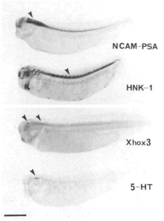embryo at the tadpole stage (stage ~36) treated with a high concentration of RA. In normal embryos, HNK-1 labels the