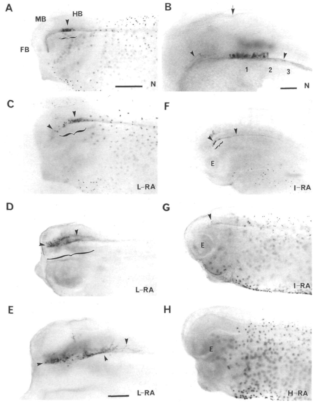 dorsal hindbrain (E) and the ectopic expression of this homeobox gene in the forebrain (D) in RA treated embryos. FB,