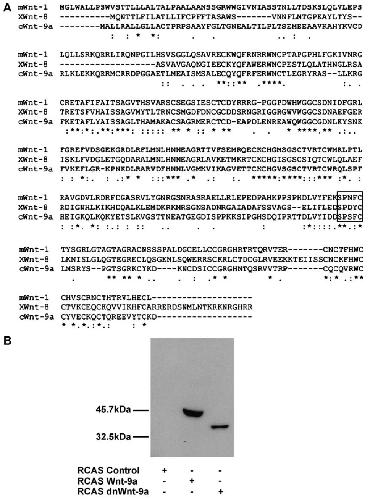 1996). A similar 288 amino acid avian Wnt-9a construct (Wnt-9aD288) was generated by truncating the C-terminal 66 amino acids after the SPSFC domain. (B)