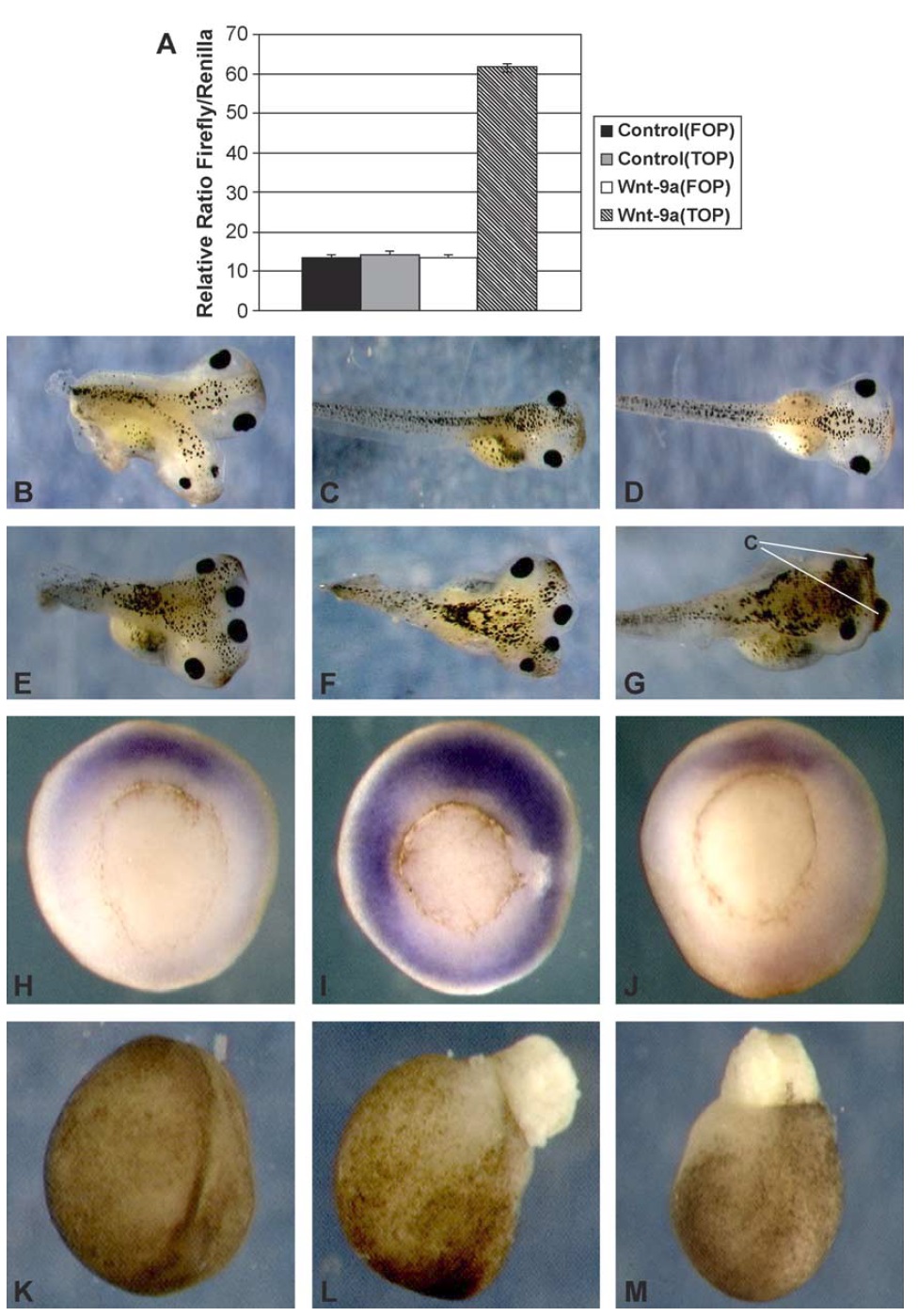 RCAS control virus does not activate the TOPFLASH or FOPFLASH reporter. (B) Wnt-9a mRNA (50 pg) injected into a ventralblastomere of four-cell