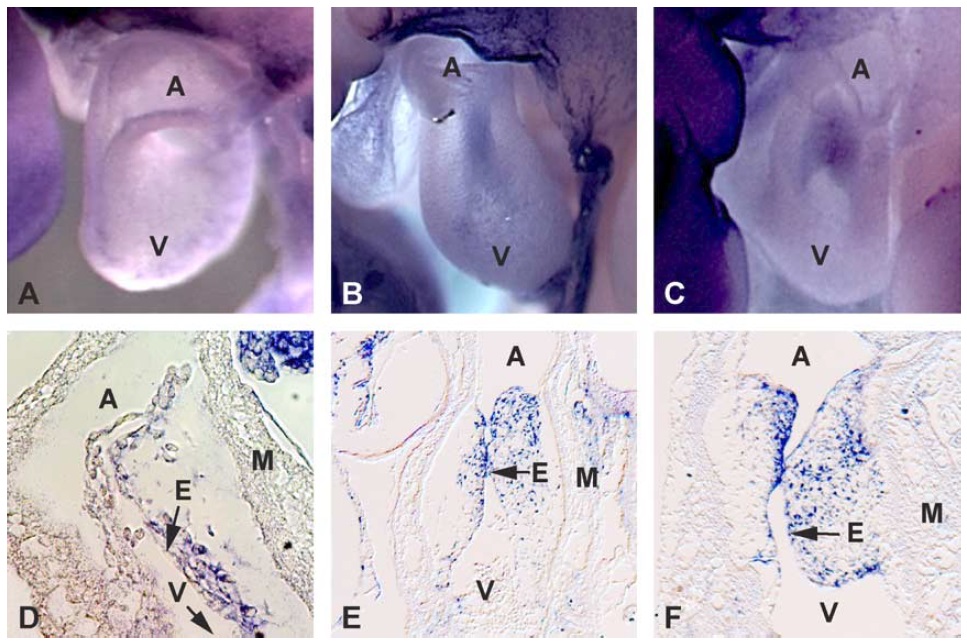 cardiac cushions of chicken hearts at stage 16 (A), stage 20 (B), and stage 24 (C). Section in situ hybridizations of stage 16 (D), stage 20 (E), and stage 24 (F)