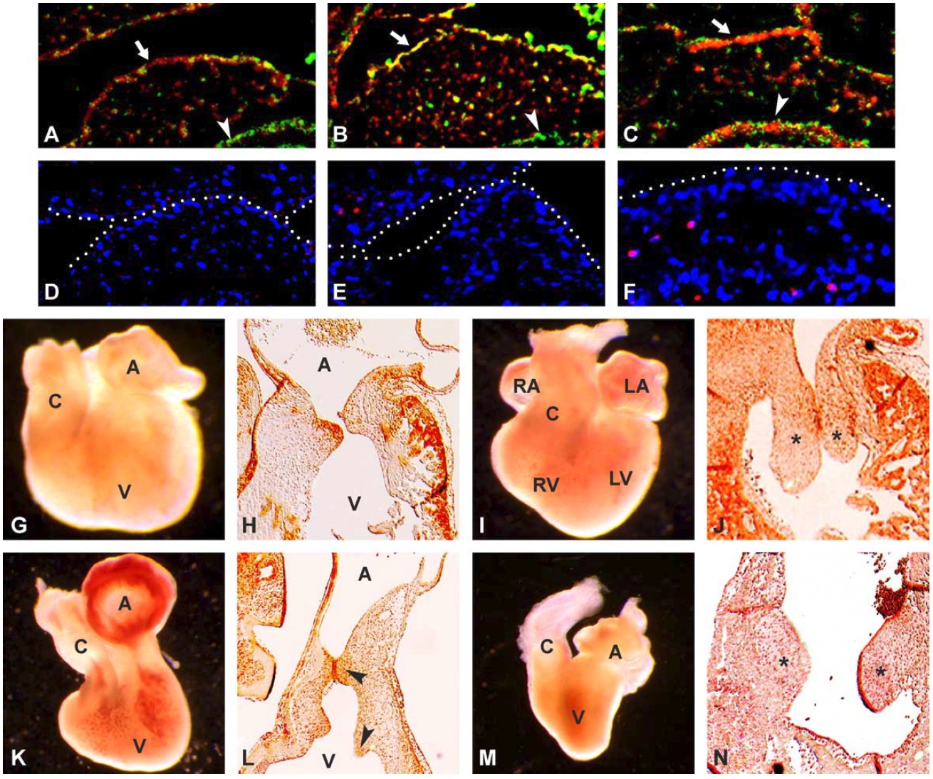AV cushions (M, N). Viral infection is detected with anti-GAG immunostaining shown in red (H, J, L, N). Abbreviations: A = atrium; V = ventricle; C = conus