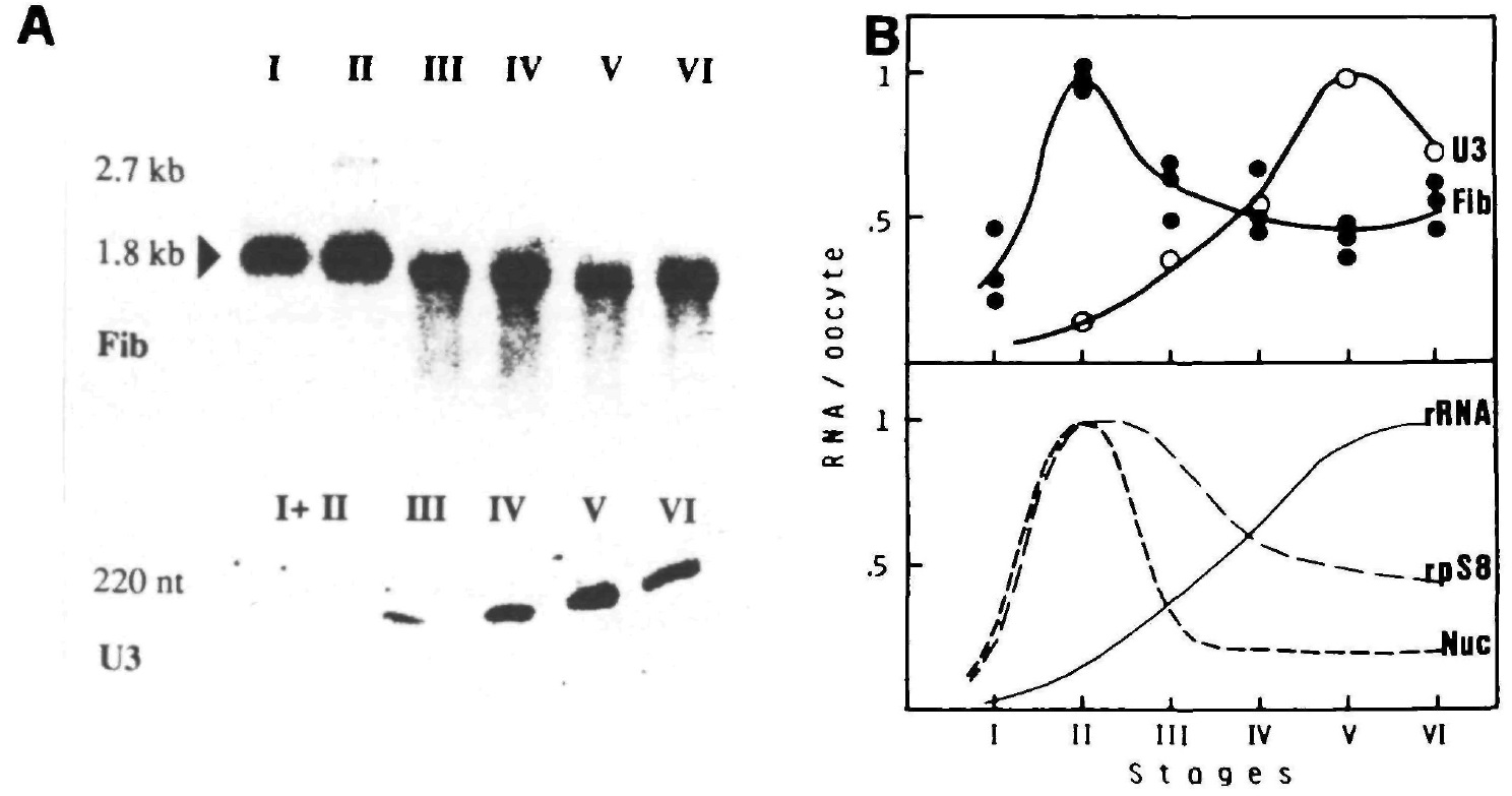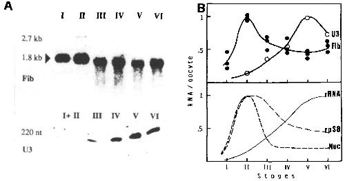 Fig. 1. Fibrillarin mRNA and U3 snRNA accumulation during oogenesis. (A) Northern blot. Fib - Total RNA equivalent to one oocyte was separated by electrophoresis in a denaturing-formaldehyde 1 % agarose gel, electrotransferred to a nitrocellulose filter and hybridized under stringent conditions with a nick-translated Xenopus fibrillarin cDNA as a probe. The slight variations of electrophoretic mobility are due to the large amount of rRNA after stage II. U3 - Total RNA equivalent to five oocytes was separated by electrophoresis in a denaturing 7 M urea-5% polyacrylamide gel, electrotransferred on a nylon filter and hybridized under stringent conditions with a 3' labeled 22-mer synthetic oligonucleotide complementary to U3 snRNA (nt 101-122) U3 snRNA was identified using CHO 32P RNA as markers. The 'smile' of the gel is artefactual. (B) Quantitative data. Relative expression of fibrillarin mRNA, U3 snRNA, S8 rp-mRNA and rRNA during oogenesis. Upper panel: values, obtained by densitometric quantitation of the experiment shown in A and of others, are expressed relative to the highest point. Fibrillarin mRNA ( ⢠â¢); U3 snRNA (O O) Lower panel already published curves for rRNA (solid line), r-protein S8 mRNA (long broken lines); nucleolin mRNA (short broken lines). |