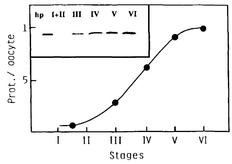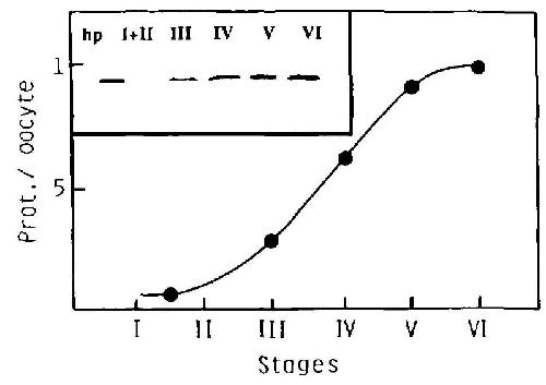 Fig. 2. Expression of fibrillarin antigen during oogenesis Total protein extracts from ten defolliculated oocytes were prepared as descnbed in Materials and methods. Proteins corresponding to five oocytes were run in each lane of a 12 % SDS-PAGE. The gel was blotted onto nitrocellulose and probed with anti-fibrillarin serum. Detection of the complexes was achieved by a second antiserum coupled to alkaline phosphatase The insert shows a typical western blot, hp, hepatocyte nuclei; I to VI oocyte stages according to Dumont (1972). The graph shows quantitative data obtained by densitometnc scanning of the western blots of different experiments. |