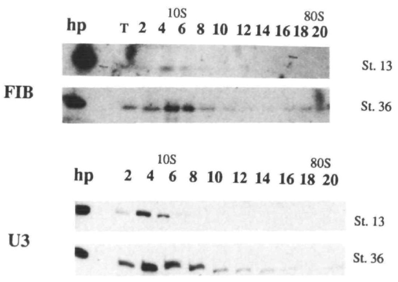 Fig. 6. Sedimentation of fibrillarin and U3 snRNA in glycerol gradients. Whole sonicates of stage 13 and stage 36 embryos were fractionated on 10-30 % glycerol gradients, and proteins and RNA extracted from gradient fractions as described in Materials and methods. FIB - western blot. Proteins were electrophoresed on a 12 % SDS-PAGE. The proteins were blotted onto nitrocellulose and probed with anti-fibrillarin serum. Detection of the complexes was achieved by 123I-protein A. Autoradiography was carried out for 20 h (stage 36) and for 72 h (stage 13). U3 - northern blot. RNA from different gradient fractions was electrophoresed on a denaturing 7 M urea - 5 % acrylamide gel, electrotransferred onto nylon filter (Hybond N) and hybridized with a 3' labelled synthetic oligonucleotide complementary to U3 snRNA (nt 101-122) Blots were exposed to X-ray films for 24 h (stage 36) and 36h (stage 13) hp, Xenopus hepatocyte nuclei; T, whole sonicate, 2 to 20, gradient fractions. |