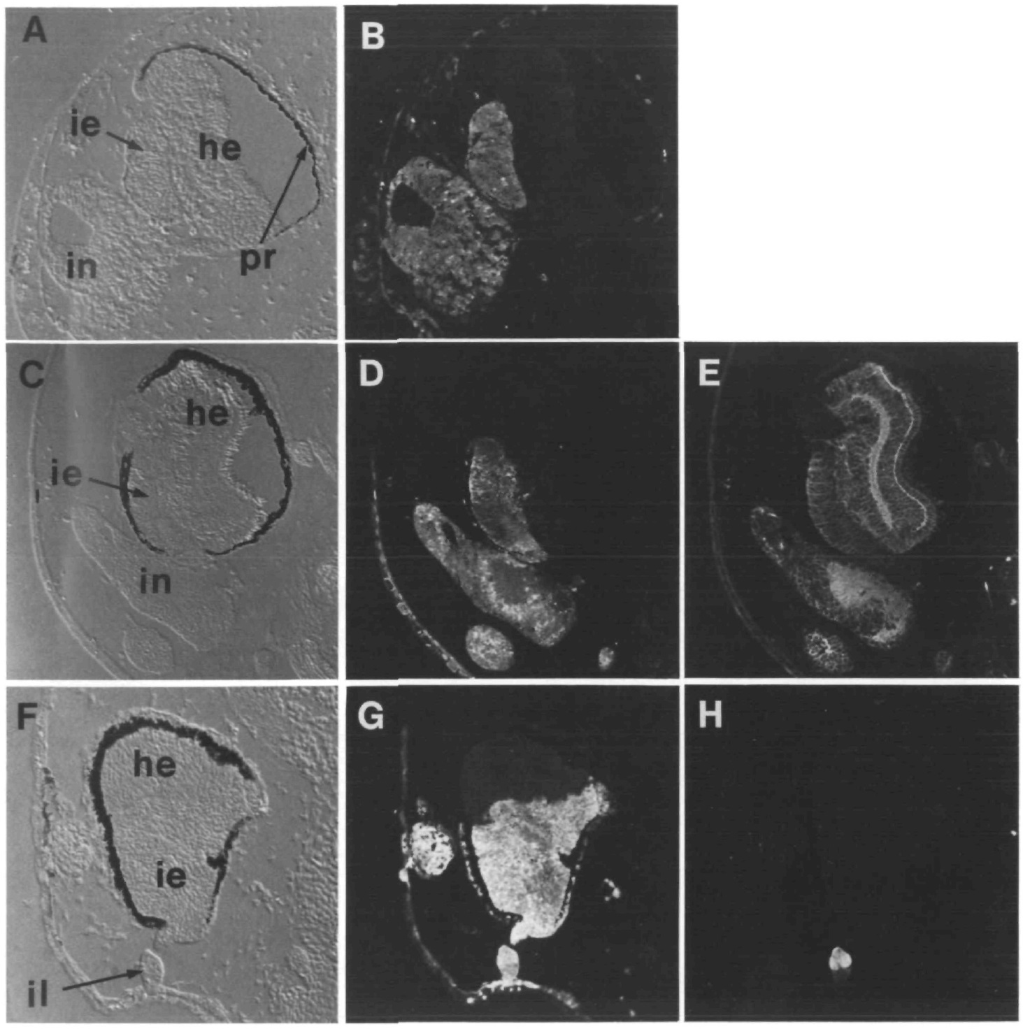 antibody; F stained with anti-lens protein antibody). Abbreviations, e, eye; in, induced neural tissue; il, induced