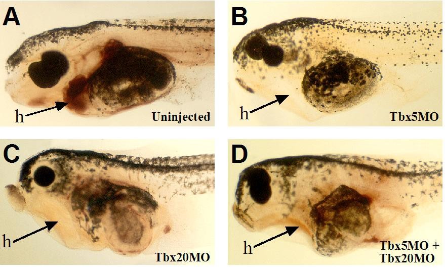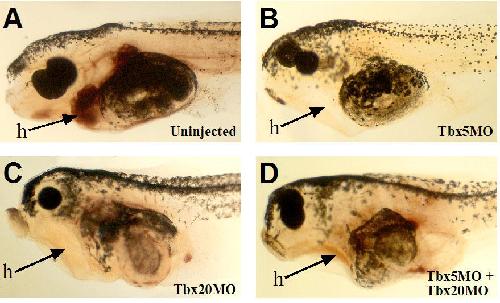 Fig. S3. Tbx5 and Tbx20 morpholinos block the formation of a functional heart as assayed by benzidine staining of erythrocytes in stage 42 tadpoles. (A) Uninjected control, (B) TBX5MO injected at optimal dose, (C) TBX20MO injected at optimal dose, (D) TBX5MO and TBX20MO injected together at suboptimal doses. There is blood staining in the heart region (h) of control embryos but not in morphant embryos.