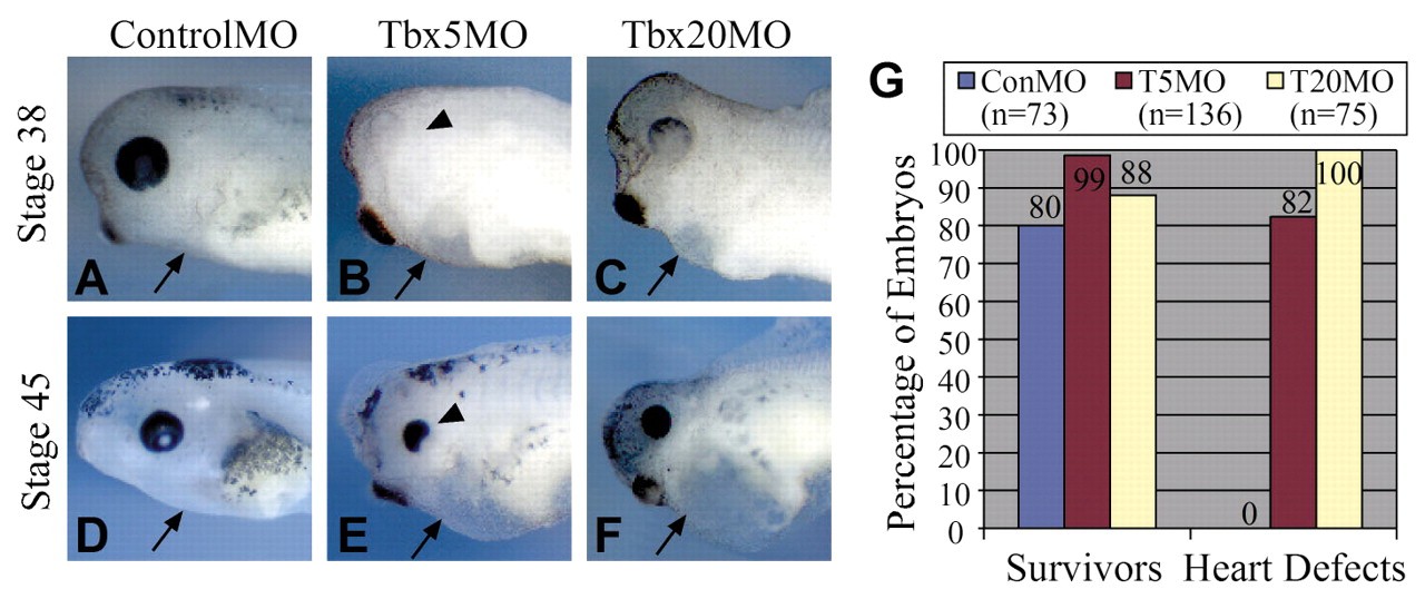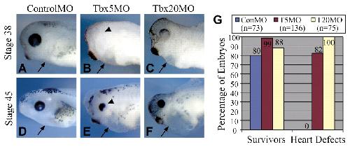 (A-F) Morpholino injected tadpoles at the indicated stages. Control morphant embryos (A,D), TBX5 morphant embryos (B,E) and TBX20 morphant embryos (C,F). Arrows indicate the heart region, arrowheads indicate the eye. (G) Chart displaying the percentage of morphants surviving and displaying cardiac abnormalities, as scored by the presence of an unlooped heart tube, a reduction in cardiac mass and the presence of a pericardial edema.