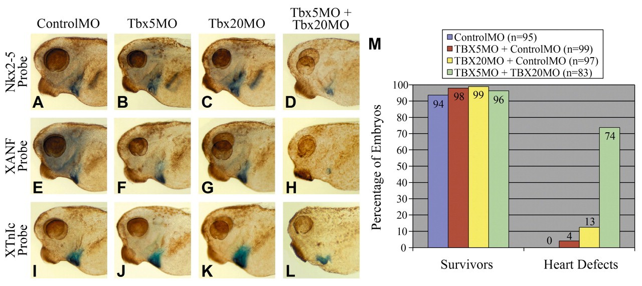 Fig. 9. Tbx5 and Tbx20 synergistically act to regulate cardiac gene expression. (A-L) Embryos injected with the indicated morpholinos at the one-cell stage. (A-D) Nkx2-5 whole-mount in situ hybridization. (E-H) XANF whole-mount in situ hybridization. (I-L) XTnIc whole-mount in situ hybridization. (A,E,I) ControlMO, (B,F,J) TBX5MO injected at suboptimal dose, (C,G,K) TBX20MO injected at suboptimal dose, (D,H,L) TBX5MO and TBX20MO injected in combination at suboptimal doses. All embryo were cleared to reveal heart expression. (M) Statistics for embryos injected with suboptimal doses of TBX5MO and TBX20MO in combination with each other or with ControlMO. Hearts were judged as having defects if they displayed a pericardial edema, an unlooped heart tube or reduction in cardiac mass.