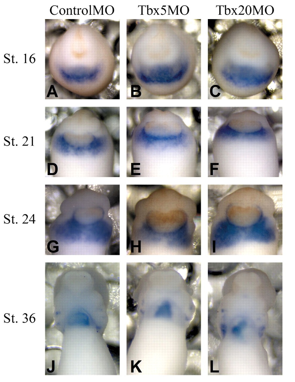 Fig. 4. Cardiac specification is unaltered in TBX5 and TBX20 morphants. Whole-mount in situ with Nkx2.5 on stage matched (A,D,G,J) ControlMO-, (B,E,H,K) TBX5MO- or (C,F,I,L) TBX20MO-derived embryos.