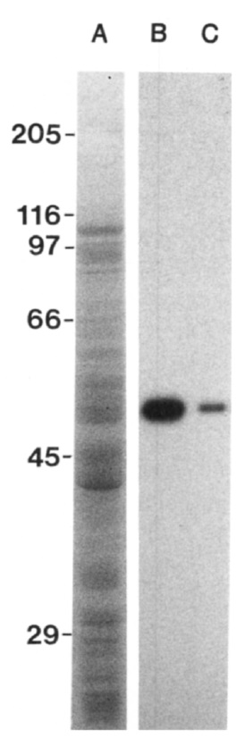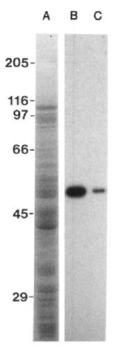 antibody against n-tubulin. (Lane C) SDS-PAGE Western blot of