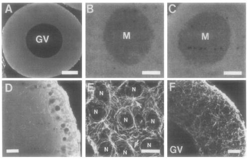 hemisphere of this enucleatcd oocyte (60X obj; bar is 12.5 nm). (D) A less ordered microtubule array in the vegetal hemisphere of an enucleated