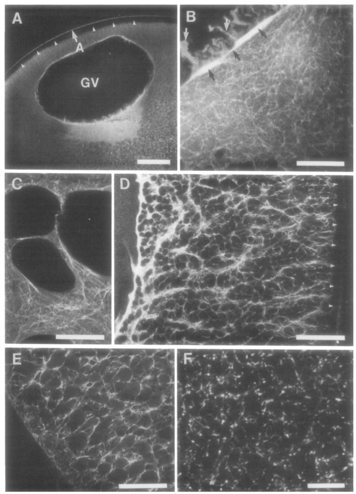 return to room temperature (60x obj; bar is 20 pm). (E) Extensive microtubule assembly is apparent in the animal hemisphere of this oocyte, 5