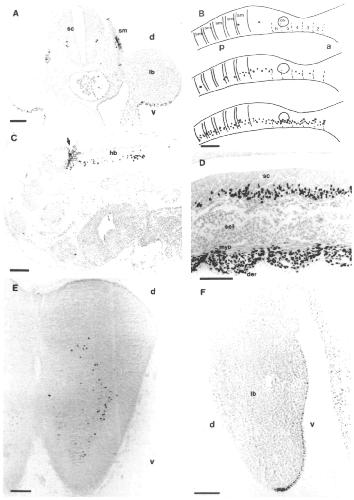 arrow indicates the mesencephalon-metencephalon border. The small arrow indicates staining myotome nuclei. (F) Trunk
