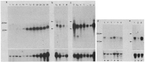 the amount of total RNA equivalent to 1.5 embryos [a, d, and e], or 10 |i,g of total RNA [b], or ~5 |xg of poly(A) +-selected RNA (c). The