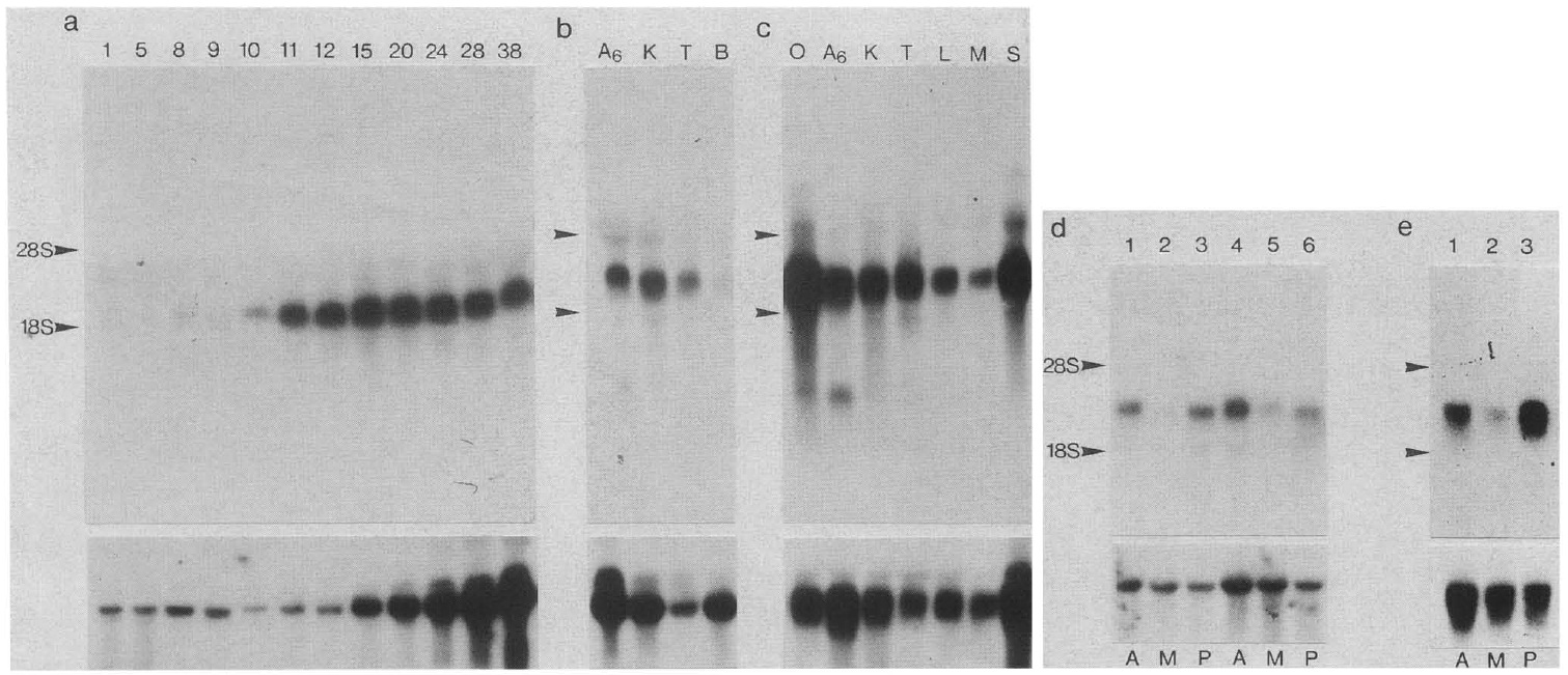 culture cells and of adult tissues [c], and total RNA of parts of dissected embryos {d, e). Embryos in a, d, and e were staged according to