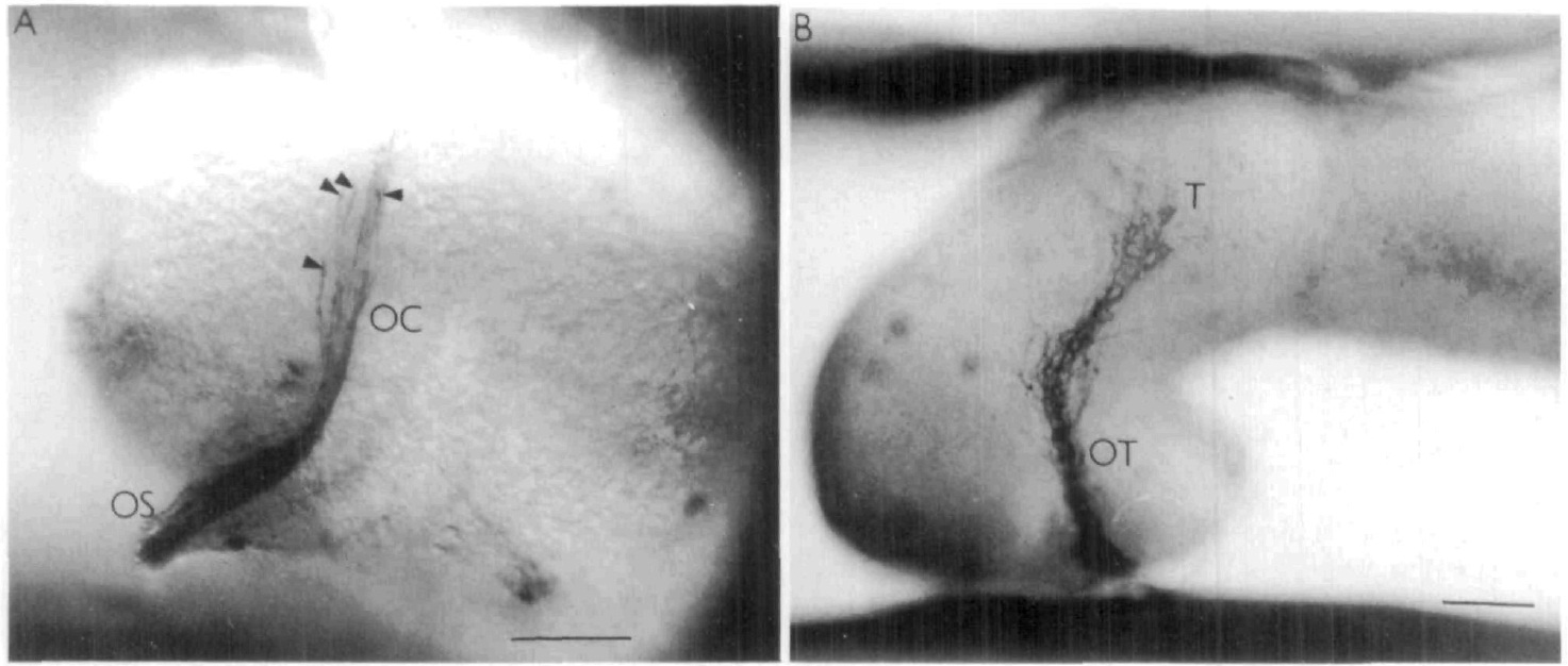 Fig. 1. (A) Ventral view of a stage 34 brain with HRP-labelled axons from the left eye leaving the optic stalk (OS) and