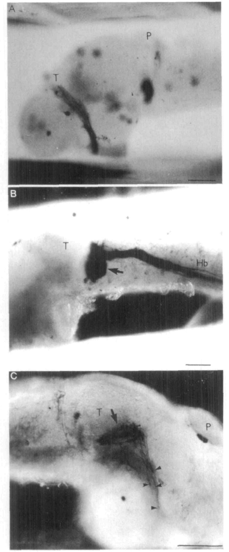 showing the early axon pathways labelled with HNK-1. The chain of cells in the lateral diencephalon (arrows) has become