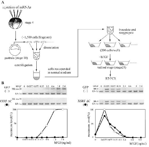 Fig. 8. Involvement of SRF in FGF-induced expression of XKrox-20 in ectoderm cells. (A) Experimental design for ectodermal cell culture assay used in B.