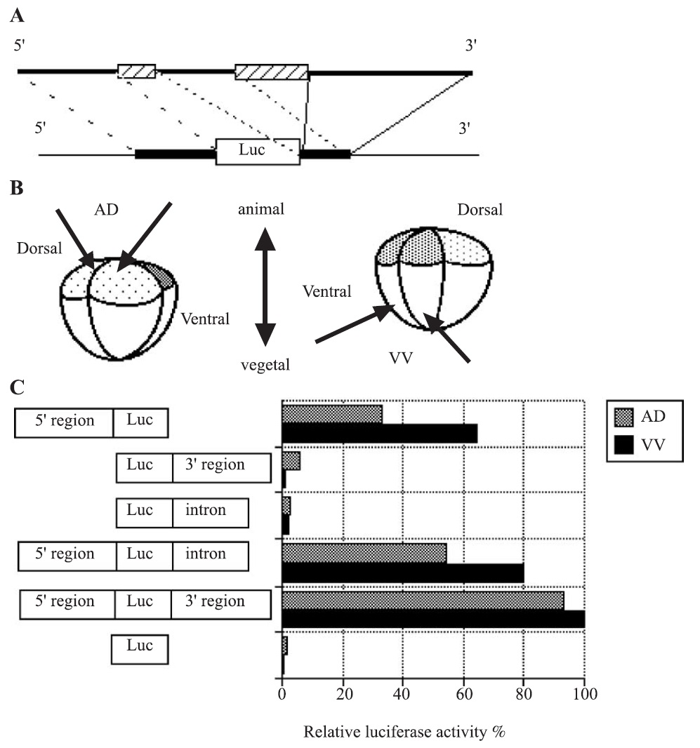 internal standard plasmid pRL-CMV that contained Renilla luciferase-coding sequence. Arrows indicate injection sites. AD; animal-dorsal. VV; vegetalventral.