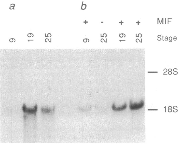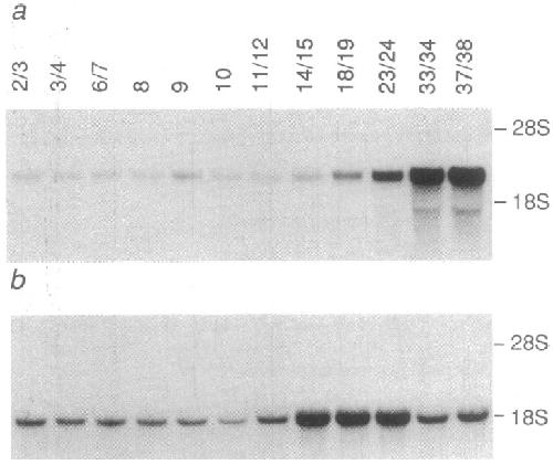 migration of 28S and 18S rRNA it indicated at right. Both films were