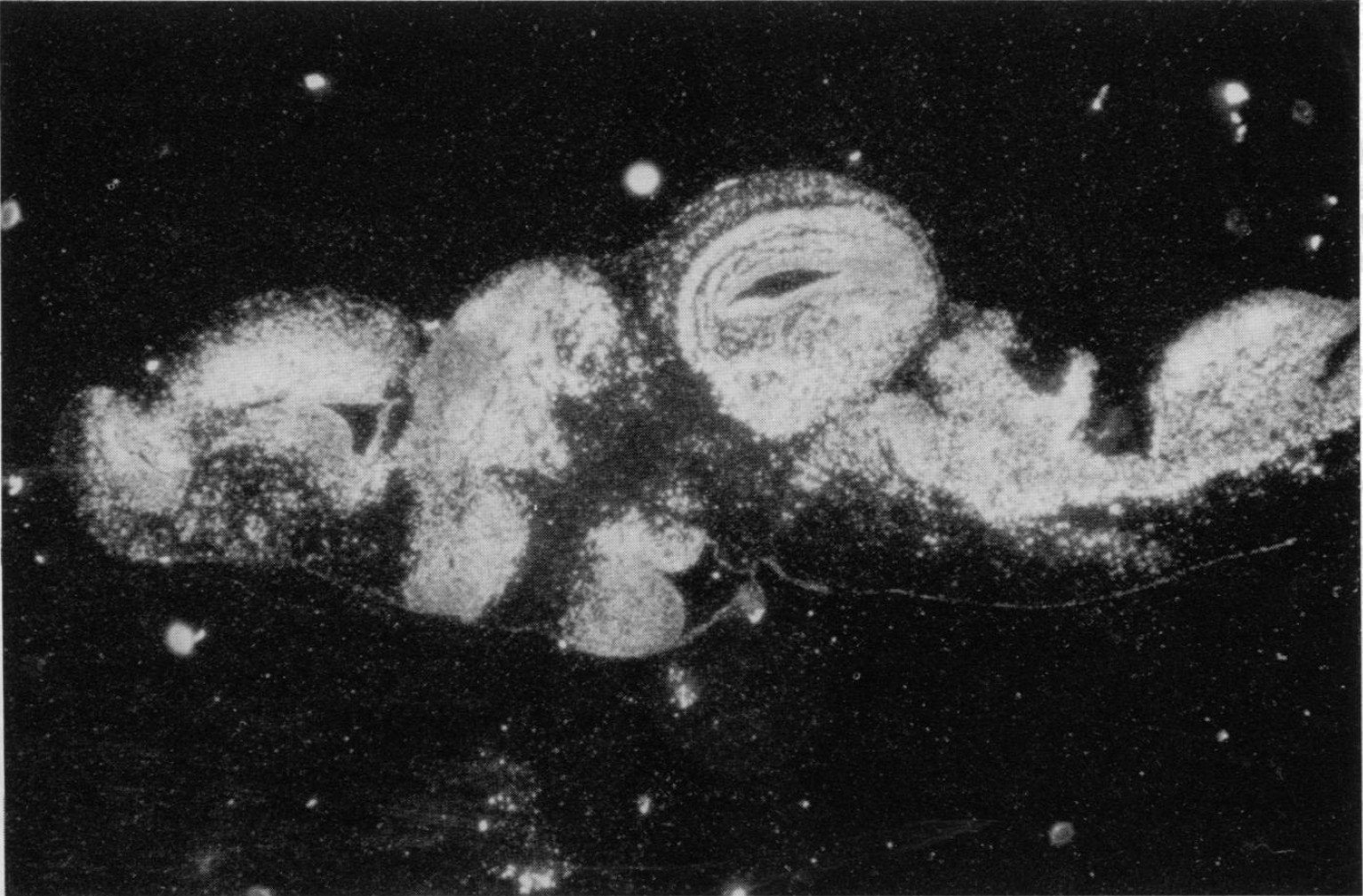 FIG. 6. In situ hybridization of antisense Na+,K+-ATPase ,B3 subunit mRNA to a sagittal section of tadpolebrain viewed with dark-field optics; anterior is at left, and dorsal is at top.