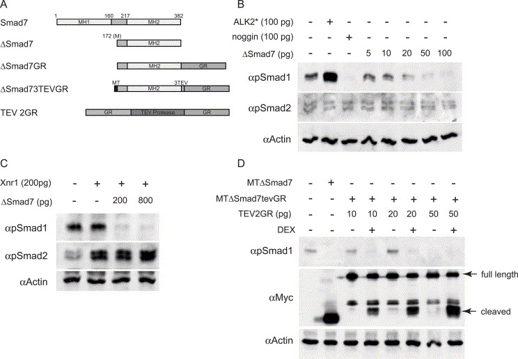 Fig. 1. δSmad73TEVGR is an inducible inhibitor of Smad1 phosphorylation. (A) Diagram of inducible inhibitor constructs. δSmad7 is a deletion of the MH1 domain of Xenopus Smad7, using the methionine at amino acid 172 as a start codon. A glucocorticoid receptor domain is fused to the C terminus of δSmad7 in the δSmad7GR construct. In the MTδSmad73TEVGR construct, three cleavage sites for the tobacco etch virus (TEV) protease are inserted between the C terminus of δSmad7 and the GR domain, and a myc tag is added to the N-terminus. The dexamethasone (DEX) inducible TEV protease (TEV2GR) consists of two GR domains flanking the TEV protease itself. (B) δSmad7 inhibits phosphorylation of Smad1, but not of Smad2. Lysates from uninjected St. 10.5 embryos or from embryos injected at the animal pole at the two-cell stage with mRNA encoding activated ALK2 (ALK2*; 100 pg/embryo), noggin (100 pg/embryo), or increasing amounts of δSmad7 were analyzed by Western blot with anti-phosphoSmad1 and anti-phosphoSmad2 antibodies. Cytoskeletal actin served as a loading control. (C) δSmad7 inhibits Smad1 phosphorylation but causes no reduction in Xnr1 stimulated Smad2 phosphorylation. Embryos were analyzed as in (B), after injection at the 2-cell stage with the indicated doses of RNA encoding Xnr1 or δSmad7 (D) TEV2GR cleaves the GR domain from δSmad73TEVGR in a regulated manner. N-terminal myc tags were added to δSmad7 and δSmad73TEVGR, and mRNA encoding these proteins were injected into two-cell stage embryos (δSmad7: 100 pg/embryo; δSmad73TEVGR: 300 pg/embryo, along with increasing amounts of TEV2GR. 10 μM DEX was added to embryos at the 8-cell stage. After lysis at St. 10.5, accumulation of the cleaved form of δSmad73TEVGR was analyzed by Western blotting with an anti-myc antibody, while concomitant inhibition of Smad1 phosphorylation was assessed using the anti-phosphoSmad1 antibody. |