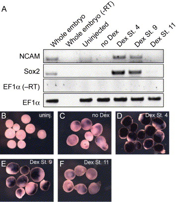 Fig. 4. Stage-dependent neural induction in isolated embryonic ectoderm. Neural induction in embryos injected with 300 pg δSmad7TEVGR and 10 pg TEV2GR was examined by RT-PCR for N-CAM or Sox-2 (A) or in situ hybridization for Sox2 (BâF). (A) Addition of DEX induces strong neural expression in caps from embryos to which DEX was added at stage 4. Neural markers are also up-regulated upon addition of DEX at stage 9, though the neural response is decreased. Neural marker expression is absent in caps to which DEX is added at stage 11. (B) Little or no Sox2 expression is observed in β-gal-injected caps or in δSmad7TEVGR/TEV2GR-injected caps to which no DEX was added (C). Caps from δSmad7TEVGR/TEV2GR-injected embryos to which DEX was added at stage 4 show strong Sox2 upregulation (D). Up-regulation of Sox2 is diminished in δSmad7TEVGR/TEV2GR-injected caps to which Dex was added at stage 9 (E), and absent upon addition of DEX at stage 11 (F). (A) This effect was also observed by RT-PCR. Little induction of the neural markers Sox2 or NCAM is observed in the absence of DEX. |