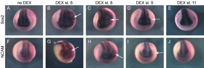 Fig. 6. Stage-dependent ectopic neural induction by δSmad7TEVGR-mediated BMP inhibition. Embryos were injected with 300 pg δSmad7TEVGR and 10 pg TEV2GR. After injection, embryos were cultured in the absence of DEX (A, F) or DEX was added at stage 6 (B, G), stage 8 (C, H), stage 9 (D, I), or stage 11 (E, J) and harvested at stage 16. Neural identity was assayed by in situ hybridization for Sox2 (AâE) or NCAM (FâJ). |