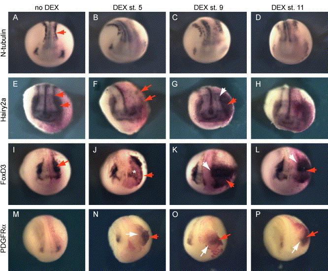 Fig. 7. Effects of δSmad7-mediated stage-dependent BMP inhibition on neural crest and neural plate border. Embryos were injected with 300 pg δSmad7TEVGR RNA and 10 pg TEV2GR RNA and cultured in the absence of DEX (A, E, I, M), or with DEX added at stage 5 (B, F, J, N), stage 9 (C, G, K, O), or stage 11 (D, H, L, P). The effects of stage-specific BMP inhibition on the neural plate border were examined by in situ hybridization for the neural border markers N-tubulin (AâD), and Hairy2a (EâH). Neural crest development was examined by in situ hybridization for Hairy2a (red arrows, EâH), FoxD3 (IâL), and PDGFRα (MâP).(For interpretation of the references to colour in this figure legend, the reader is referred to the web version of this article.) |