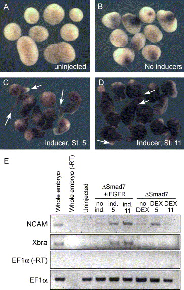 Fig. 10. FGF activation lengthens the period of neural competence in animal caps and induces expression of Xbra. Embryos were injected with 20 pg iFGFR1 and 300 pg δSmad7tevGR/10 pg TEV2GR RNA. Inducers (10 μM DEX and/or 1.25 μM AP20187) were added at stage 5 (C) or stage 11 (D). Animal caps were cut at stage 9 and collected at stage 14, when they were subjected to either to in situ hybridization for Sox2 or to RT-PCR. No Sox2 expression is detected in caps from uninjected embryos (A), and minimal Sox2 is present in caps from injected embryos to which no inducer was added (B). Strong up-regulation of Sox2 is observed in caps to which inducers were added at stage 5 (C). Addition of inducers at stage 11 also strongly activates Sox2 expression (D). This is in contrast to caps from embryos injected with δSmad7tevGR and TEV2GR and activated at stage 11 (compare with Fig. 4F). Note the elongation in caps induced at both stage 5 and stage 11 (arrows, C, D), suggesting mesoderm induction due to the activation of FGF. (F) RT-PCR for NCAM confirms the ability of iFGFR and δSmad7tevGR, but not δSmad7tevGR alone, to induce neural development when activated at stage 11. RT-PCR for Xbra further supports the induction of mesoderm in iFGFR- and δSmad7tevGR/TEV2GR-injected caps, but not in caps injected with δSmad7tevGR and TEV2GR alone. |