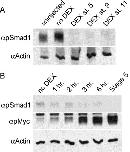 Fig. 3. Inhibition of pSmad1 occurs rapidly after DEX addition. (A) RNA was into both cells of two-cell stage embryos, animal cap explants were isolated at stage 8 and DEX was added when sibling embryos were at either stage 9 or stage 11. The caps were then allowed to develop overnight at 14°C, until sibling embryos had reached stage 16, when they were harvested and phosphoSmad1 levels were analyzed by Western blot. (B) mRNA encoding 300 pg δSmad73TEVGR and 10 pg TEV2GR was injected into both cells at the two-cell stage. Animal caps were isolated and assayed by Western blot with anti-phosphoSmad1 antibody. Cytoskeletal actin was used as a loading control. Culture of embryos and caps was carried out at 14°C. DEX was added either before caps were cut (St. 5) or 6, 3, 2, and 1 h before harvesting at stage 10. One hour after DEX addition, pSmad1 inhibition is substantially inhibited. By 3 h after addition, pSmad1 levels are equivalent to that observed in caps from embryos to which DEX was added at stage 5. |