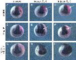 Fig. 8. FGF activation must be combined with BMP inhibition to induce ectopic neural expression during gastrulation. Embryos were injected with 20 pg iFGFR1 RNA (A–C), 300 pg δSmad7TEVGR and 10 pg TEV2GR RNA (D–F), or 20 pg iFGFR1 + 300 pg δSmad7TEVGR/10 pg TEV2GR RNA (G–I). Inducer (10 μM DEX and/or 1.25 μM AP20187) was added at stage 5 (B, E, H) or stage 9 (C, F, I). In the absence of inducer, ectopic neural induction is not observed in injected embryos (A, D, G). No ectopic neural induction is observed on the injected side (arrows) in iFGFR1-injected embryos when AP20187 is added at stage 5 (B) or stage 9 (C). Ectopic neural induction is observed in δSmad7TEVGR/TEV2GR-injected embryos upon addition of DEX at stage 5 (arrow, E), but induction is minimal when DEX is added at stage 9 (arrow, F). FGF activation and BMP inhibition appear to act synergistically, as strong ectopic neural induction is observed when iFGFR and δSmad7TEVGR/TEV2GR are combined, both when inducer is added at stage 5 (H) or at stage 9 (I). |