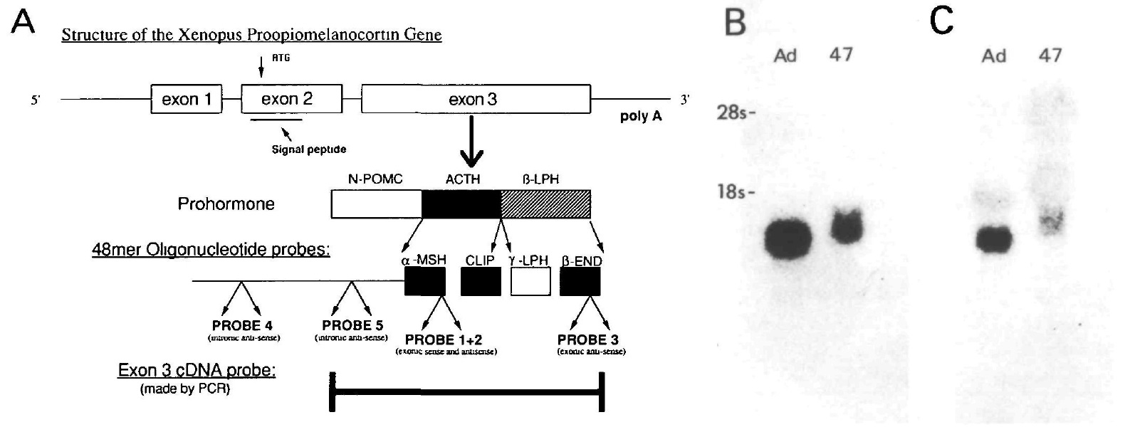 blots (B,C) showing probe specificity. (A) The POMC gene is comprised of three exons with exon 1 encoding the 5'