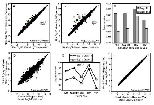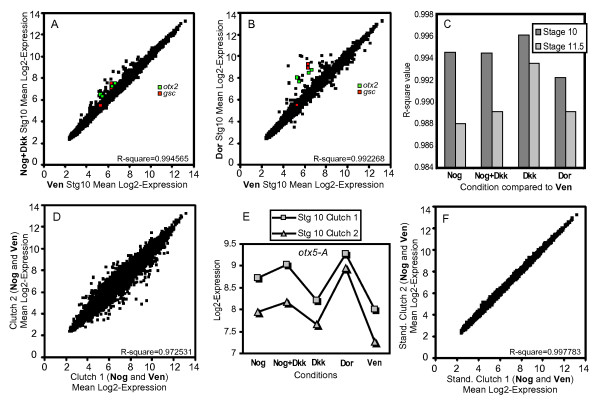 Figure 2. Expression variation among the samples. (A) and (B) show scatter plot comparisons of the mean Nog+Dkk or Dor stg. 10 log2 expression values vs the mean stg. 10 Ven log2expression values. Probe sets measuring two known organizer genes, otx2 (green) and gsc (red), are labeled within the plots (otx2 probe sets: Xl.1268.1.S1_at, Xl.3004.1.A1_at, Xl.11672.1.A1_at, and XlAffx.1.11.S1_at; gsc probe sets: Xl.801.1.A1_at, Xl.801.1.S1_at, and Xl.801.1.S1_s_at). (C) R-square regression value summaries for each experimental condition compared to the stage-matched ventral condition. (D) Scatter plot comparison of the mean Nog and Ven clutch-1 log2 expression values vs. the mean Nog and Ven clutch-2 log2 expression values. Note that the clutch variation clearly exceeds differences between the experimental conditions (A-C). Contributing to this variation, many genes show a shift in the average expression between the two clutches, but retain a similar pattern in response to the experimental conditions. As an example, log2 expression values for otx5-A (Xl.3452.1.A1_at) are shown in (E). After standardizing the average log2 expression of both clutches, on a gene-by-gene basis, the comparison from (D) was repeated in (F), eliminating most clutch variation.