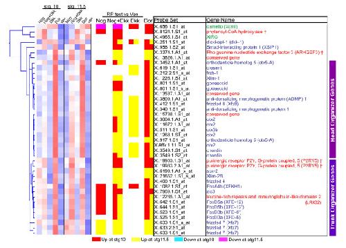 Figure 4. Cluster 3 is enriched for genes involved in organizer function. This figure shows an enlarged view of all of the genes in cluster 3, from Figure 3. Each row is annotated with the probe set number and matching gene name. Genes with names in blue have a described role in organizer function. Genes with names in red have no described function during gastrula stage development. Genes with names in green have a published role or expression pattern that is not organizer related. † gene name was assigned by protein sequence homology using the NCBI Homologene database.