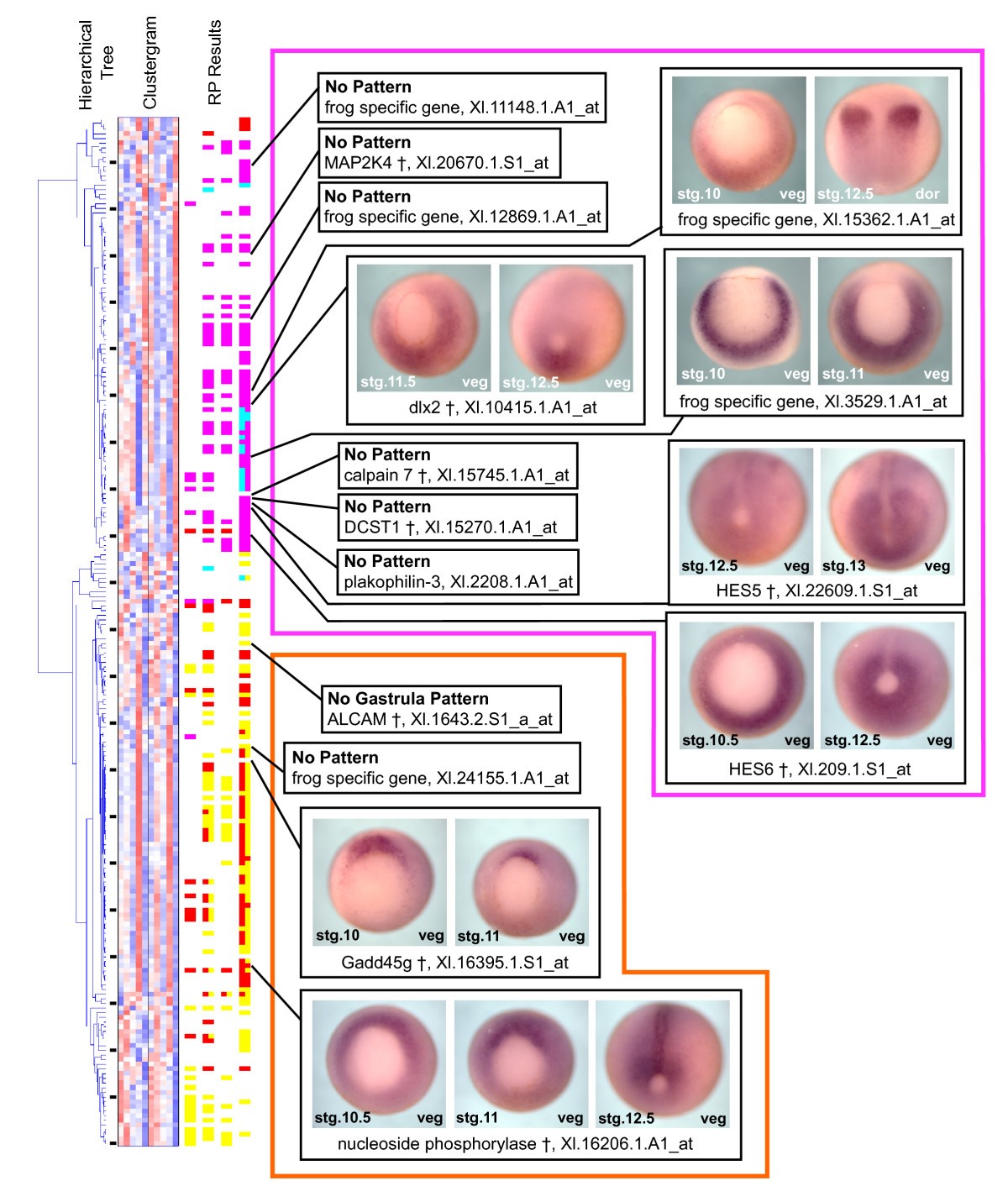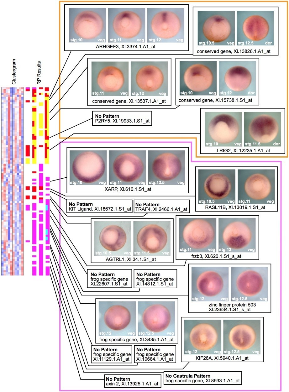 Figure 7. Relaxed statistical criteria select for additional genes with organizer-related expression patterns. The cluster results for the second set of RP criteria, which required correlated expression in the Nog+Dkk and Dor conditions, identifies additional unknown genes with organizer-related expression patterns. The hierarchical tree is on the far left, followed by the clustergram, and then the summary of the RP results at 10% FDR. Colors and columns are same as described in the Figure 3A. Black ticks between the cluster tree and the clustergram mark every tenth gene, allowing referencing to 3 for the gene identities. Genes in this list that lacked described gastrula stage expression patterns were analyzed by whole mount in situ hybridization. The top of the cluster contains genes that were repressed in the Nog+Dkk and Dor conditions; unknown genes within this group are excluded from organizer tissues (magenta box). The bottom of the cluster contains genes that were activated in the Nog+Dkk and Dor conditions; unknown genes within this group are enriched in organizer tissues (orange box). Each tested gene is labeled with its name and the Affymetrix probe set number. Genes marked "no pattern" showed no staining, or a non-specific staining pattern that was similar to sense controls. Genes marked "no gastrula pattern," showed no pattern during gastrula stages, but did show specific patterns at later stages that are not shown here. Each photo is labeled with the developmental stage of the embryo in the bottom left corner, and the orientation in the bottom right corner. veg: vegetal view, dorsal faces up. dor: dorsal view, anterior faces up. gene name was assigned by protein sequence similarity using Homologene.