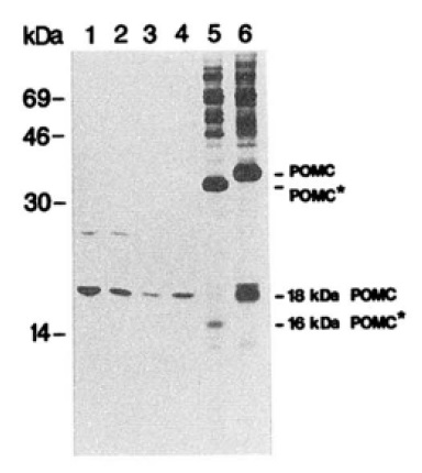 treated; lanes 2, 4, and 6 are controls. *, not glycosylated POMC.