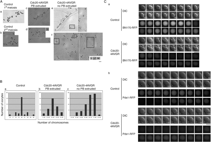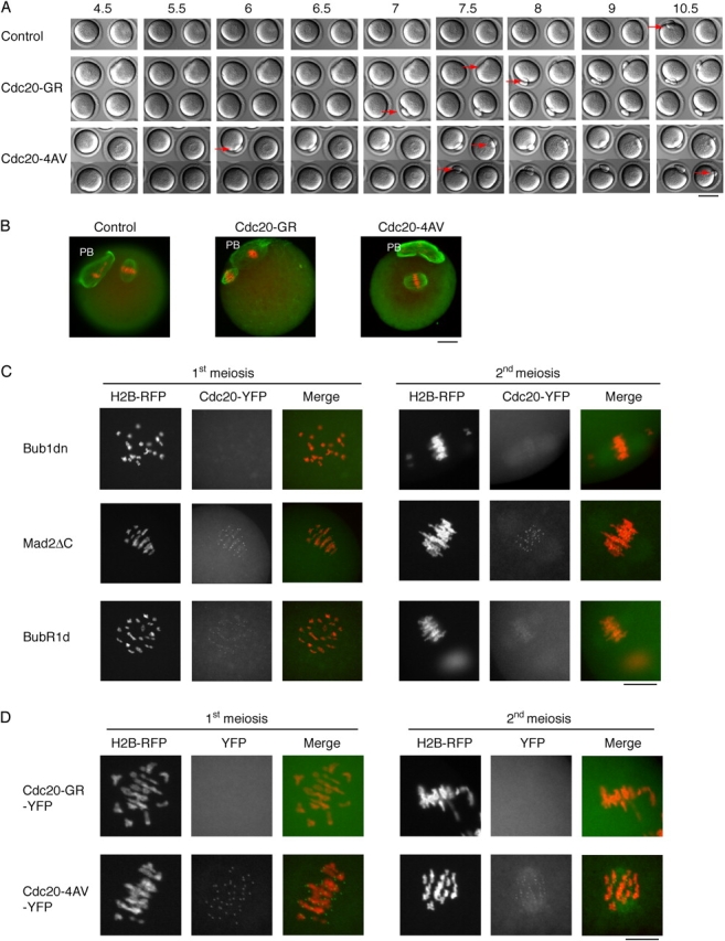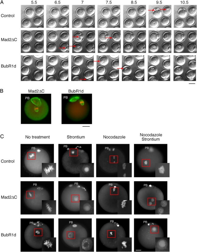 In Xenopus oocytes, the spindle assembly checkpoint (SAC) kinase Bub1 is required for cytostatic factor (CSF)-induced metaphase arrest in meiosis II. To investigate whether matured mouse oocytes are kept in metaphase by a SAC-mediated inhibition of the anaphase-promoting complex/cyclosome (APC/C) complex, we injected a dominant-negative Bub1 mutant (Bub1dn) into mouse oocytes undergoing meiosis in vitro. Passage through meiosis I was accelerated, but even though the SAC was disrupted, injected oocytes still arrested at metaphase II. Bub1dn-injected oocytes released from CSF and treated with nocodazole to disrupt the second meiotic spindle proceeded into interphase, whereas noninjected control oocytes remained arrested at metaphase. Similar results were obtained using dominant-negative forms of Mad2 and BubR1, as well as checkpoint resistant dominant APC/C activating forms of Cdc20. Thus, SAC proteins are required for checkpoint functions in meiosis I and II, but, in contrast to frog eggs, the SAC is not required for establishing or maintaining the CSF arrest in mouse oocytes.