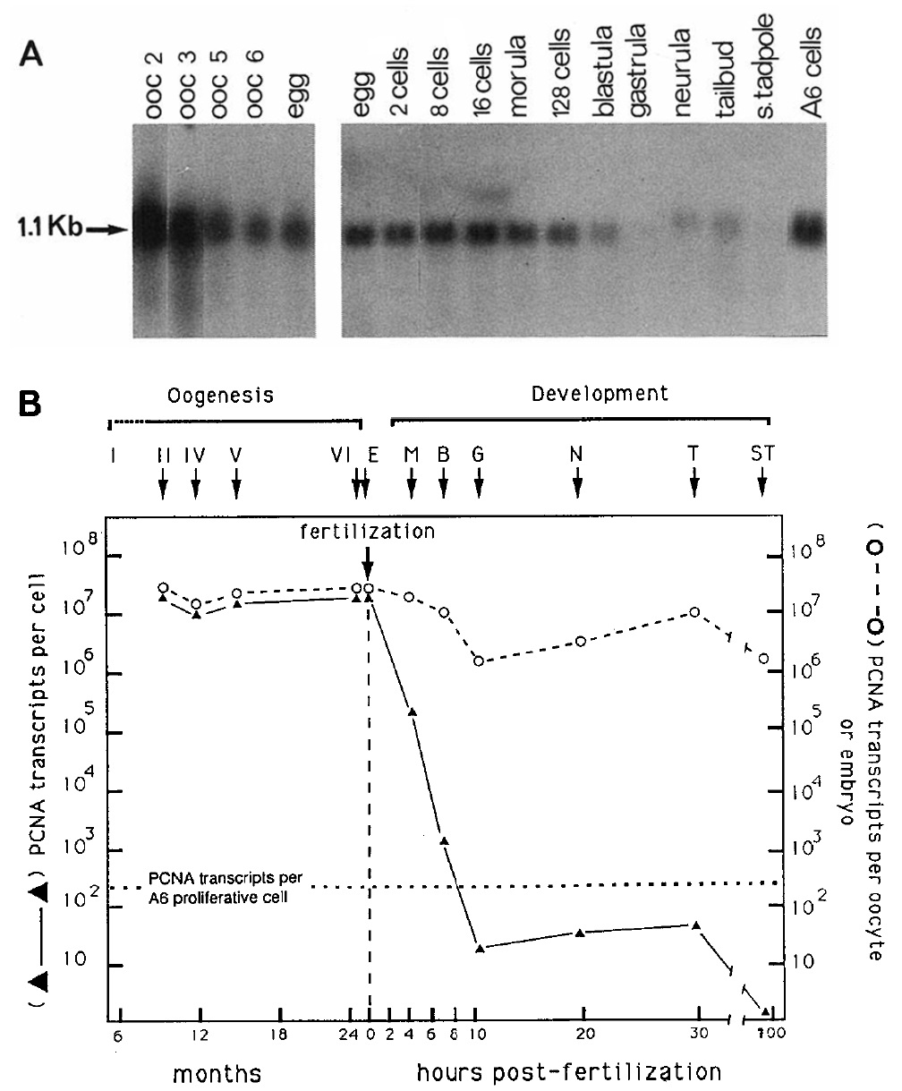 above and analyzed in the same experiment. The slight decrease in PCNA in the morula and tailbud stages was not observed in other