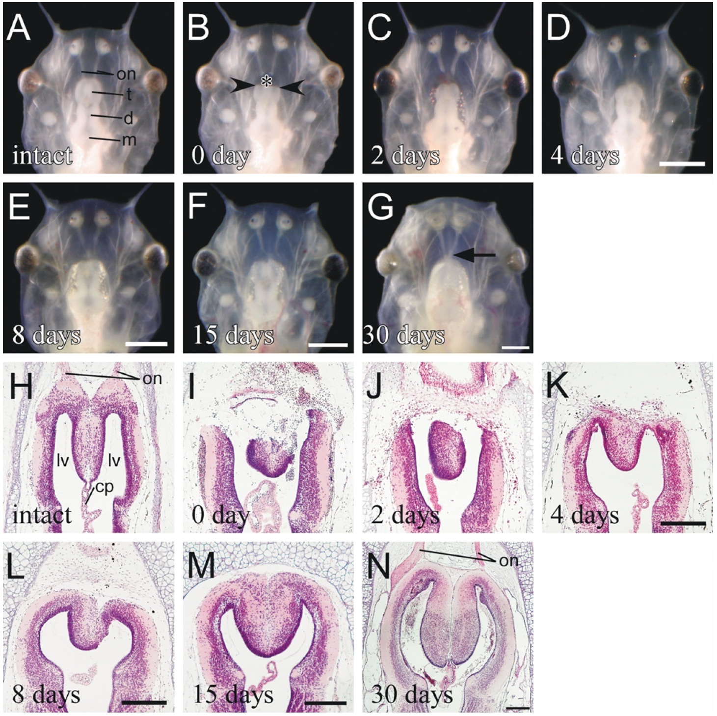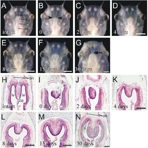 regenerated brain was extended anteriorly (L,M). After 30 days, the telencephalon returned to a normal structure with olfactory nerve