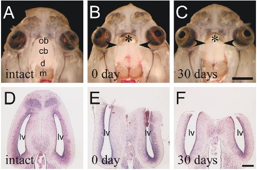after the tissue dissection, the ventricles were open at the anterior end (B–E). As late as 30 days after the removal of tissue, the