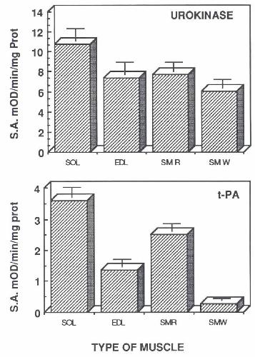Extracts were obtained as described in Barlovatzet al. (19901. To measure urokinase content, the assay was performed in rhe presence of 400 nM plasminogen and 1.6 mM of rhe synthetic substrate 5-2251. Plasmin generation was detected by measuring p-nirroaniline release from the substrate. To measure t-PA content, fibrin-bound t-PA was determined in the presence of O.2,uM of plasminogen and O.6mM of the synthetic substrate CBS 3308. Values are expressed in specific activities (mOD/mini mg prot)o Both slow Soleus and fast EDLmuscles contained more UK than t-PA bur rhe amount was larger in Soleus, indicating greater myogenicity.
