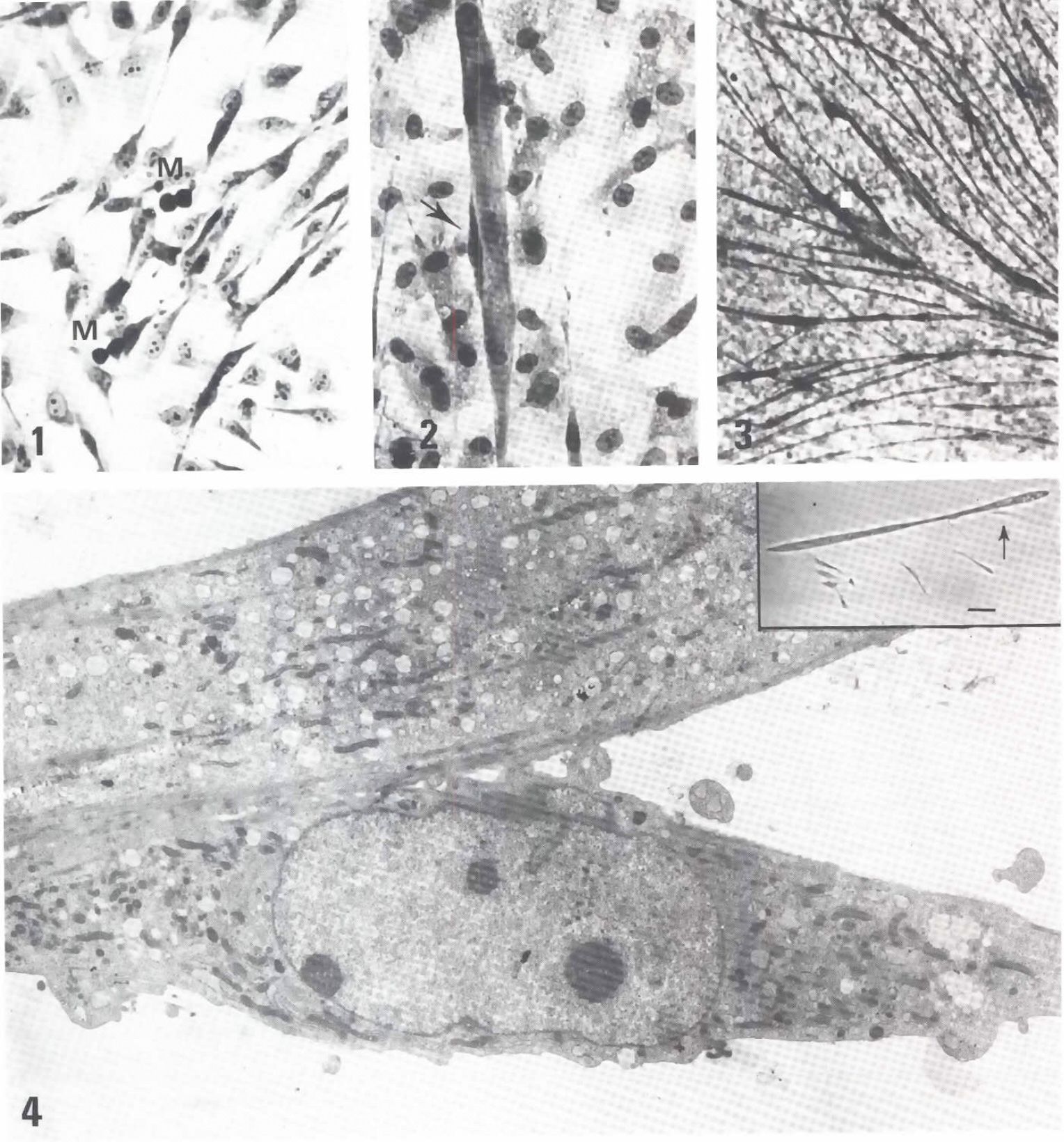 Figs. 1-.4. Histology of in vitro myogenesis. (1) 4-day rat myogenic cell culture before the beginning of cell fusion. Glemsa srainmg (x450i. M: Mltosis. (2) 6-day culture; early myotube with a cell in satellite-like position (arrow). Giemsa staining (x45OJ. (3) Low magnification view of a 14-day culture showing a network of myotubes. Giemsa staining (x 150). (4) Electron micrograph of fusion between the early myotube and rhe satellite cell mdlcated by an arrow in the Inset. Distinct remnants of rhe myorube and the satellite cell membranes are still visible in the contact and consecutive fusion area (x4400; Inset x100)