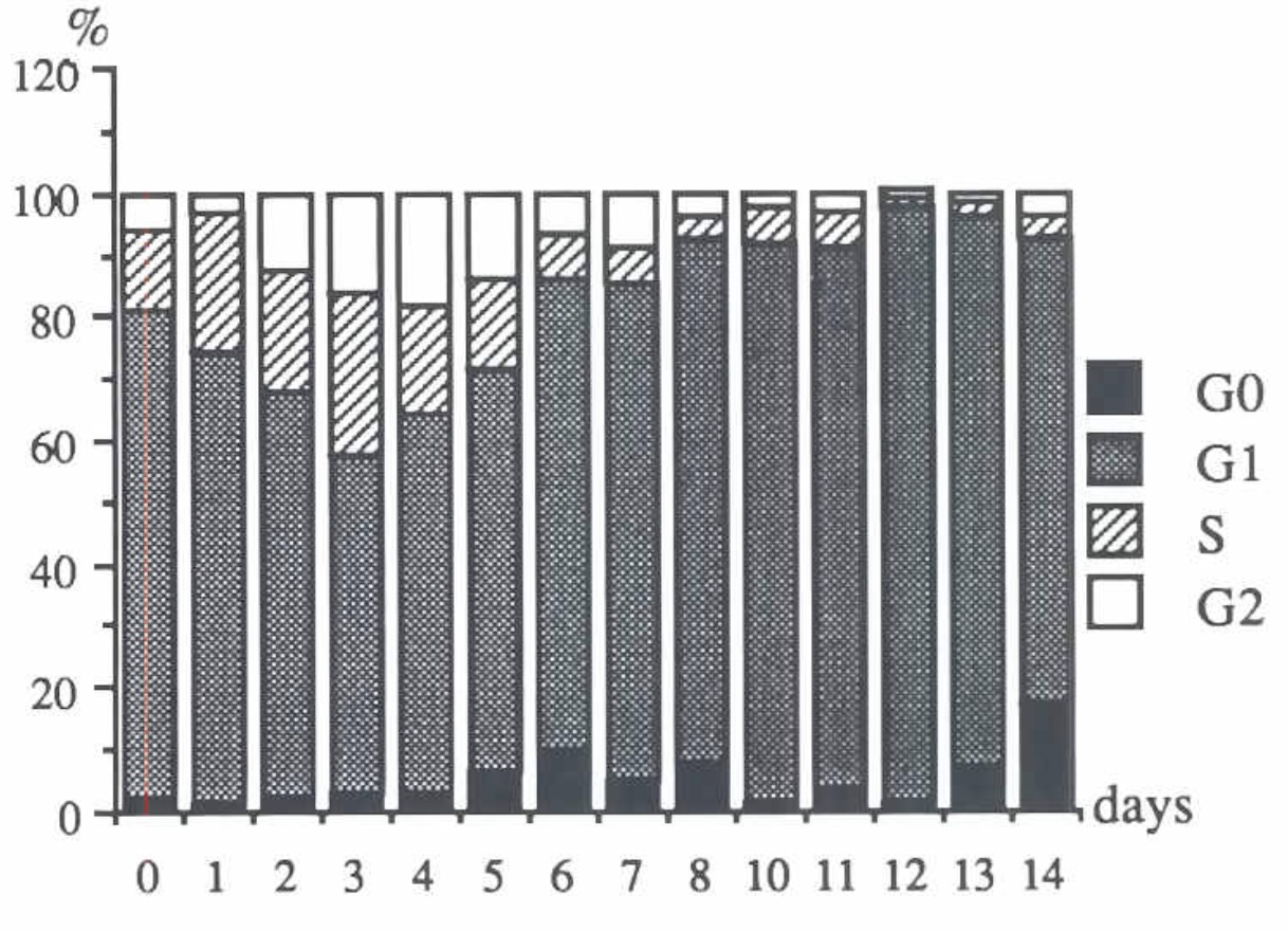 Fig. 6. Variations in the percentage of cells In GO. G 1, S. and G2 phases dUring 14 days of rat satellite cell cultures obtained from Image analysis